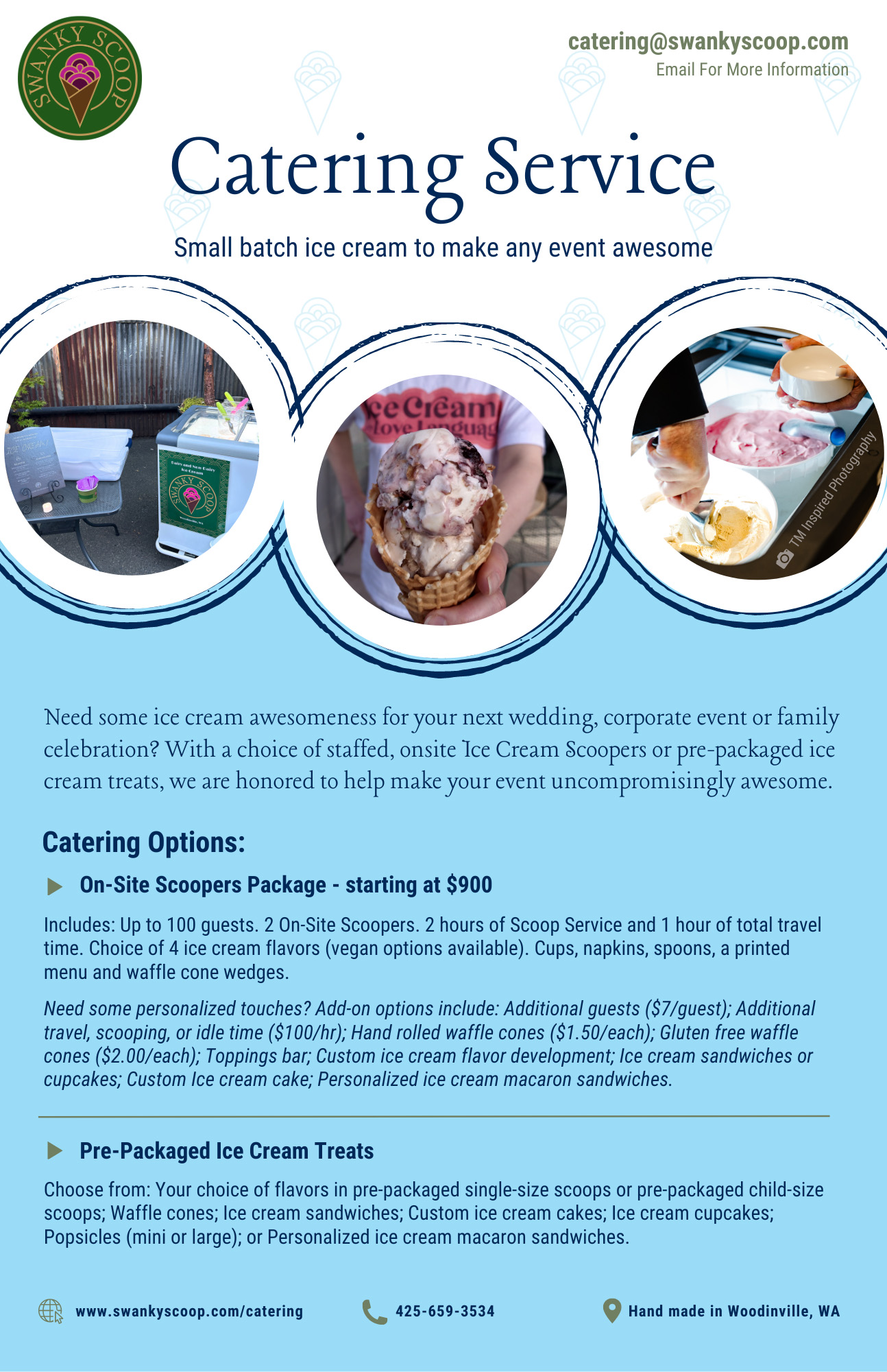 Filling out our Catering Inquiry Form is the first step in booking Swanky Scoop at your event. After you have submitted your form, we'll reach out to you to provide pricing and availability details.